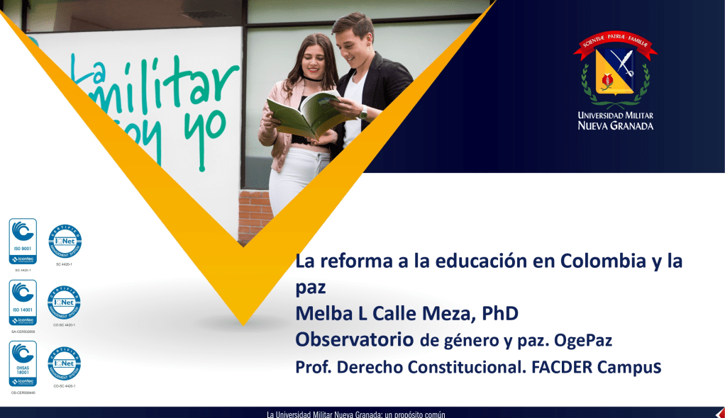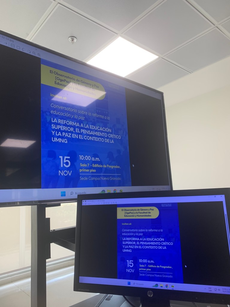 El 15 de noviembre de 2023, en la sede de Cajicá de la Universidad Militar Nueva Granada (UMNG) se reunieron los abajo firmantes para realizar el primer conversatorio sobre la reforma a la educación y la paz en la UMNG. Esta es una propuesta académica surgida en el marco de las actividades del Observatorio de Género y Paz. OgePaz–EsaeNG-Facultad de Derecho Campus en coordinación con la Facultad de Educación y Humanidades.